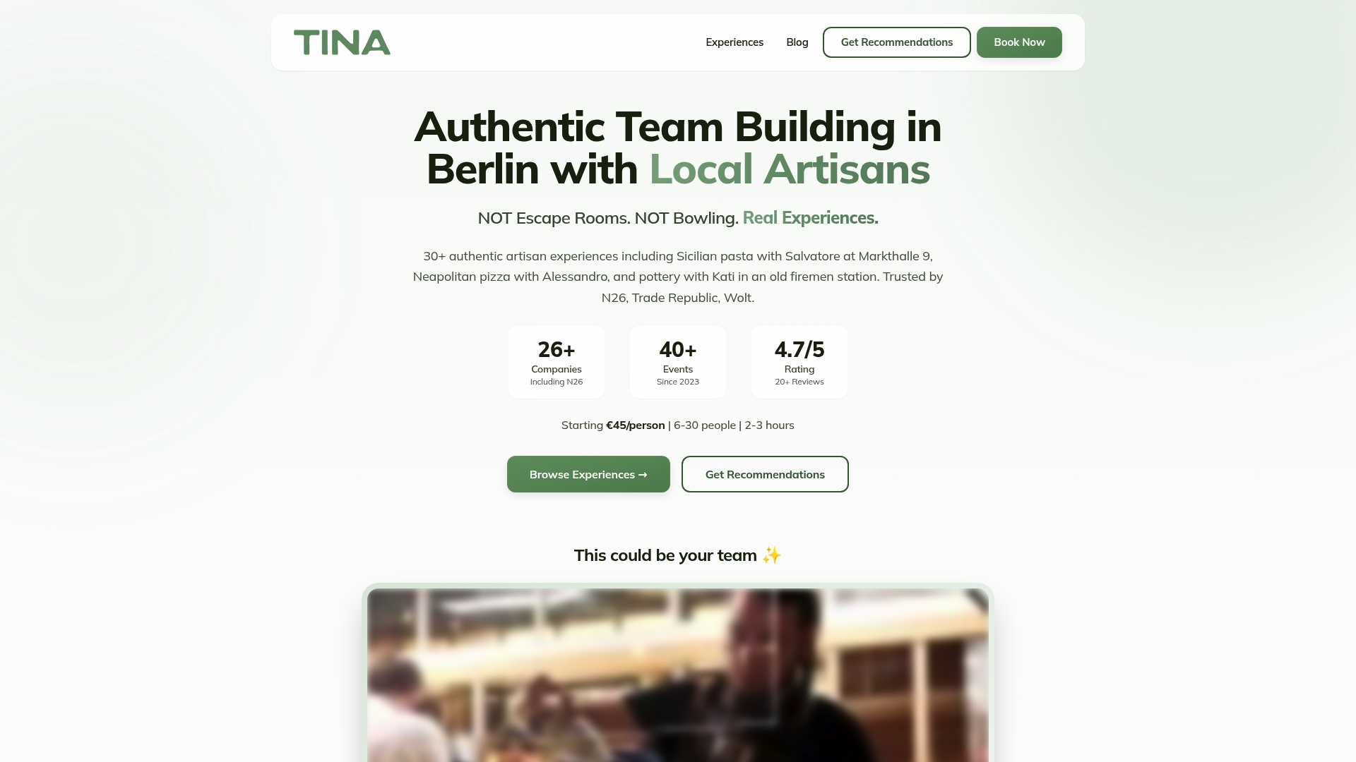 | TINA | Artisan workshops by local experts; cooking, pottery, crafts; tailored solutions | Cultural authenticity; Skill-based tangible outcomes; Transparent pricing | Berlin-centric | €45–€120 per person; curated packages |