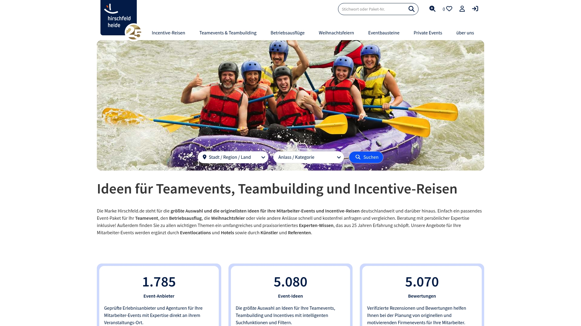 Hirschfeld.de is a curated events marketplace that helps companies plan employee events, incentive trips, and corporate celebrations across Germany. It pairs expert event advice with a broad network of regional partners to help HR teams find original concepts quickly.