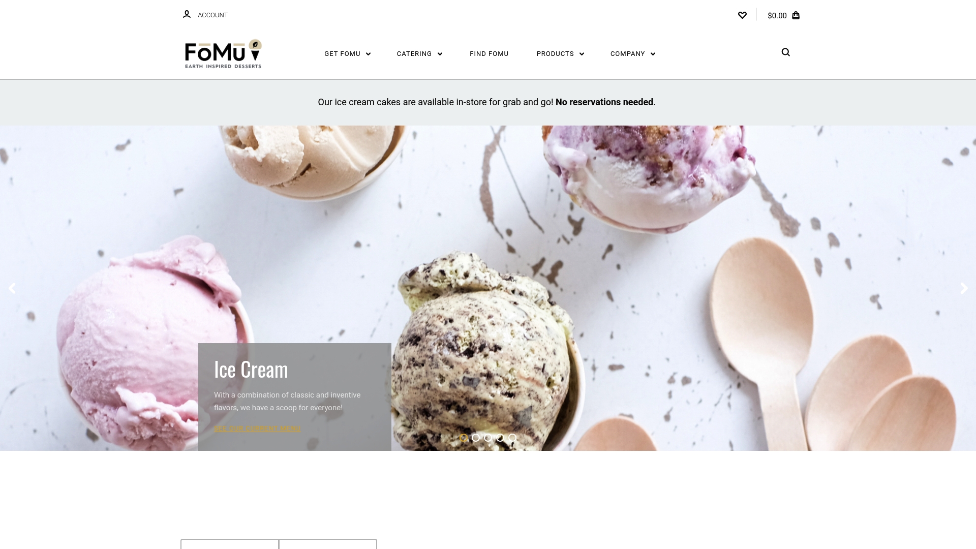 FoMu focuses on a variety of ice cream flavors, handmade cookies, and ice cream cakes available for grab-and-go or delivery. The brand also offers event catering options and gift cards, plus a newsletter for promotions.