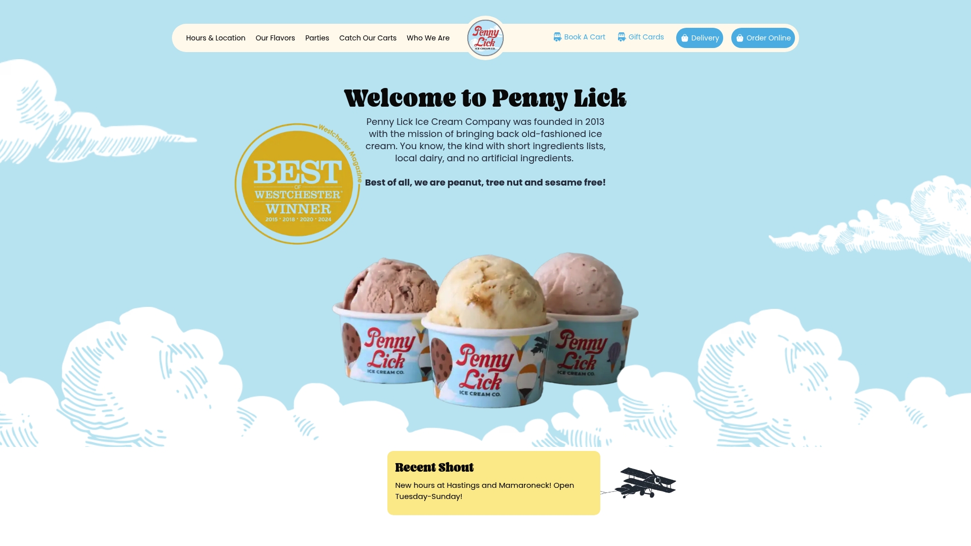 Penny Lick centers on old-fashioned ice cream made from short ingredient lists and local dairy, with no artificial ingredients listed. They guarantee peanut tree nut and sesame free offerings and provide seasonal flavors plus custom ice cream cakes and mobile cart catering.