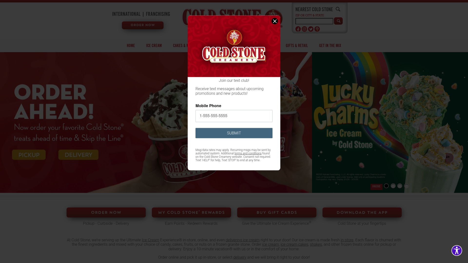 Cold Stone focuses on made-in-store ice cream with a wide selection of mix-ins and toppings, plus online ordering and delivery. The brand also offers ice cream cakes, shakes, a rewards program, gift cards, and catering for events.