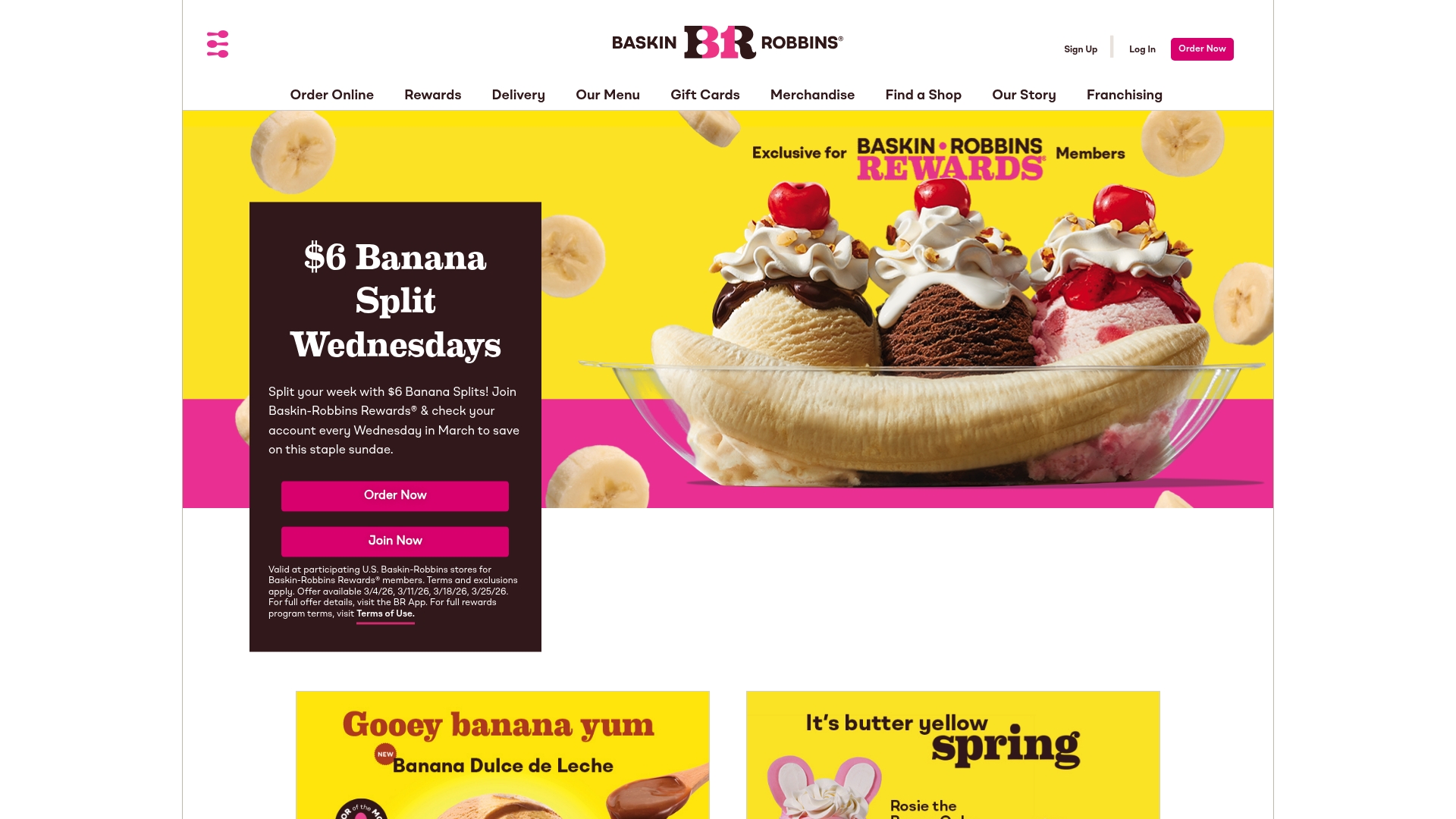 Prices vary by product and location, with member discounts and occasional promotions. Example offers listed include $6 Banana Split Wednesdays and app member savings that lower the overall cost for repeat orders.